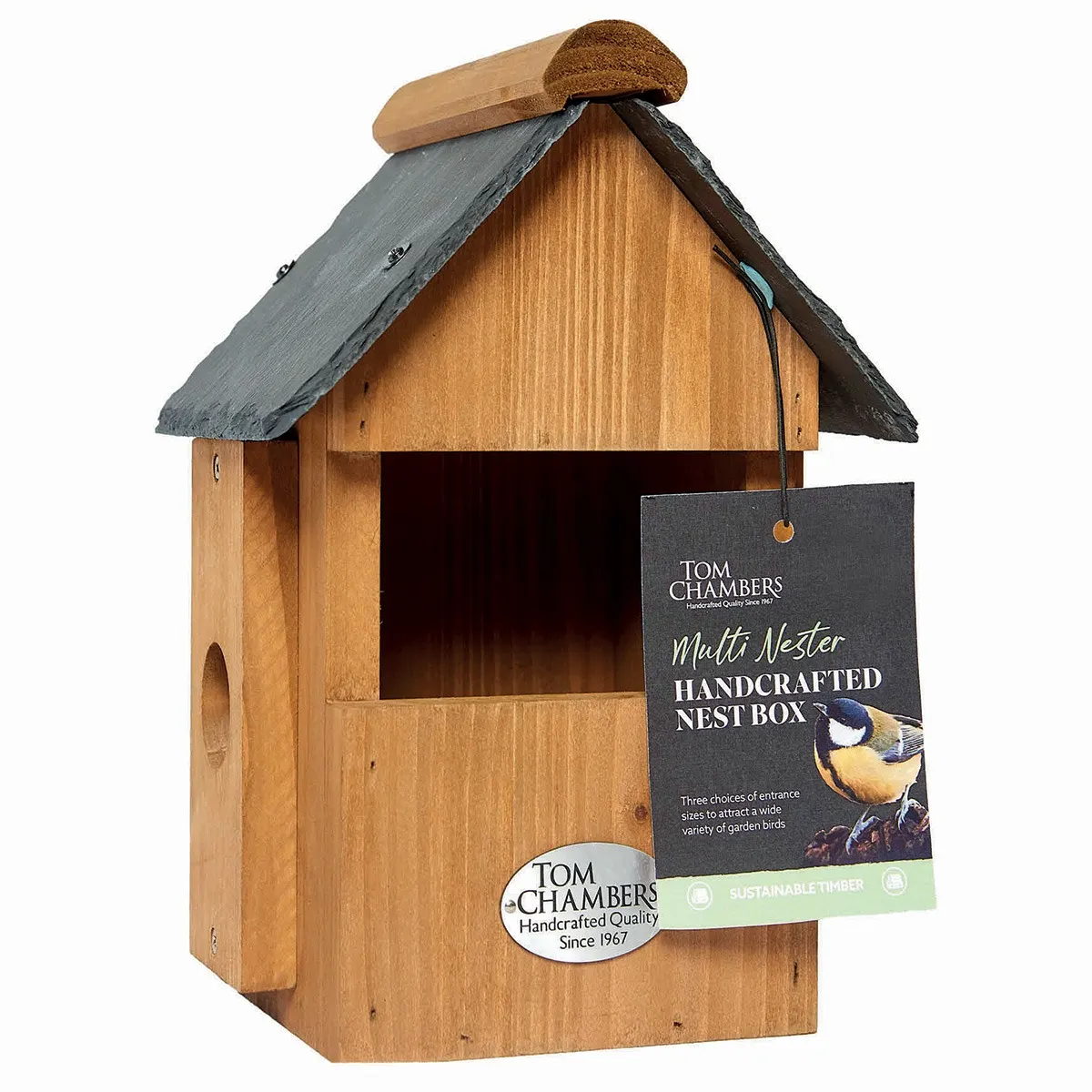 A multi nest box would be a welcome gift for any bird lover. This one has 3 interchangeable entrances and a slate roof.