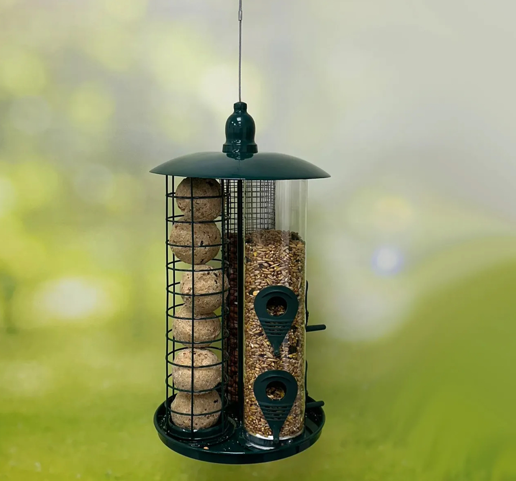 - Combines seed, peanuts and fatballs in one feeder.